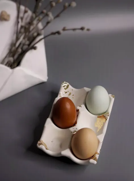 Лотки и подстаки для яиц изготавливают из керамики и фарфора, можно найти на 6 ямочек или на 12, белые или разноцветные. Выглядят они необычно и очень стильно, так что отлично подойдут для оригинального оформления пасхального завтрака.