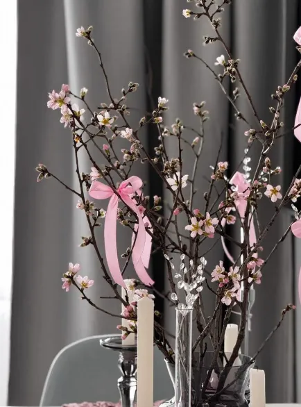 Живые веточки цветущих кустарников и деревьев сейчас тоже можно найти в цветочных салонах или заказать онлайн. Их, конечно, нужно ставить в вазы на самые видные места. Один из самых простых способов обновить пространство и просто порадовать себя, причем, довольно долгое время, потому что они стойкие.