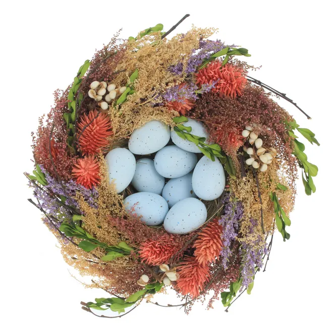 Если скатерть и посуда яркие, с орнаментом, сочетайте их с лаконичными гнёздами одного цвета. Но если вы используете текстиль базовой приглушённой палитры, то можно использовать акцентные элементы — например, этот венок-гнездо из самых разных искусственных трав и растений. В комплекте — голубые яйца-муляж, которые при желании можно заменить на съедобные.