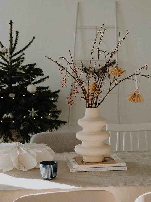 — Есть ли у вас полки и поверхности с керамикой? Если да, то заполните их праздничной листвой, — советует Мари. — Существует множество красивых вариантов праздничной листвы, например, папоротники, ягоды остролиста и снежноягодника, и не забудьте сначала проверить свой двор на наличие красивых веток, стеблей и ягод.
