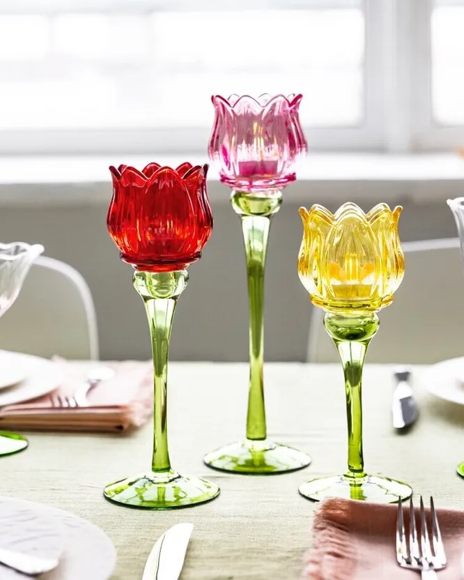 Подсвечники со стильным весенним дизайном никогда не будут лишними. Можно составить моно-композицию из «тюльпанов» одного цвета, а можно собрать букет из всех оттенков. Будет красиво в любом случае.