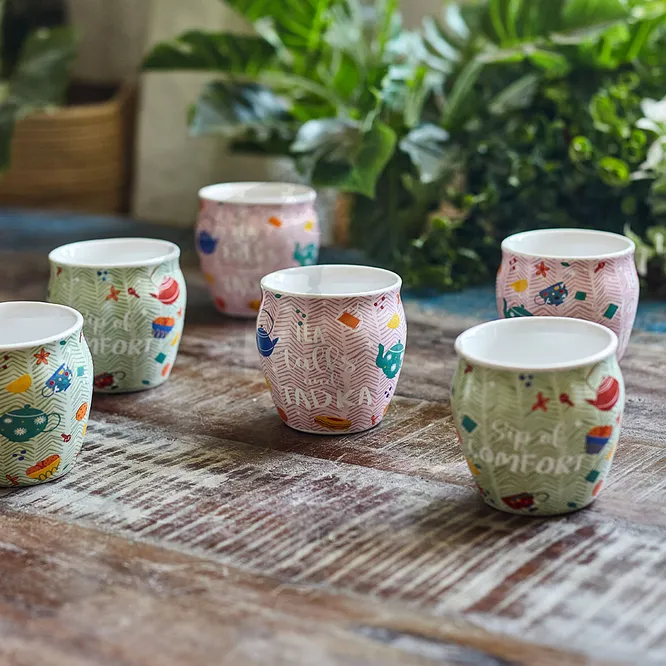 Милые стаканчики с принтами, напоминающими о первых весенних цветах, солнце, загородном отдыхе, долгих тёплых вечерах разнообразят интерьер кухни в эко- и этностиле. Керамика долговечна и устойчива и к мытью в посудомоечной машине, и к нагреванию в микроволновой печи.