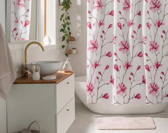 В весеннем обновлении может нуждаться и ванная комната. Крупные цветы на тканевой шторе визуально увеличивает объём помещения и делают дизайн более динамичным.