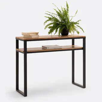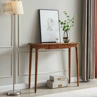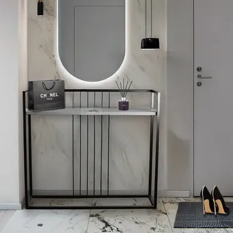 В этом варианте есть всё, чтобы сделать небольшую прихожую функциональной: место для сидения, универсальный стол, источник света и, конечно же, аксессуары, придающие выразительность интерьеру. Консольные столики и полуконсоли хороши тем, что они выглядят визуально легче и изящные своих более вместительных собратьев. И если нет задачи «впихнуть невпихуемое», выбор практически идеальный.