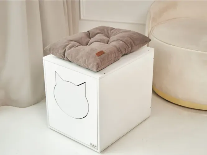 Стильная минималистичная тумба-кубик позволит спрятать кошачий лоток на самом видном месте. Она не пропустит запах, а если нужно стряхнуть с лап наполнитель, на выходе можно подложить специальный резиновый коврик с ячейками. Сверху можно положить подушку и устроить лежанку для кота или место для переобувания — кому как удобно.