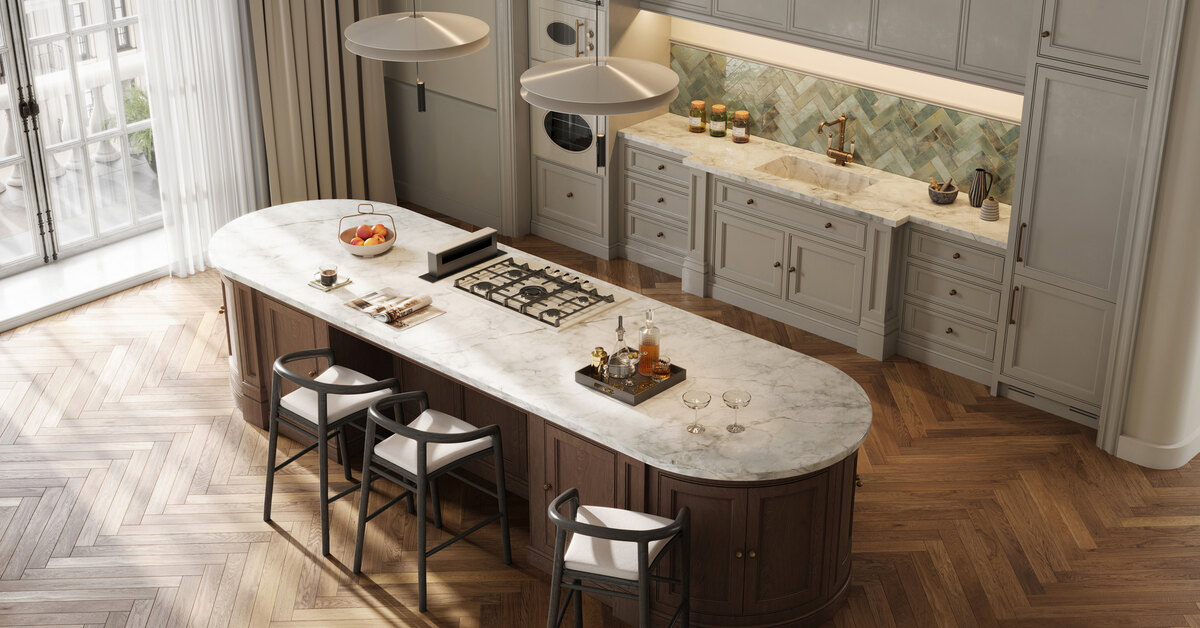 Кухонные столешницы из (или с имитацией) мрамора с крупными прожилками, кварца и гранита — скульптурные, яркие, самобытные. Такой элемент служит акцентом в дизайне и привносит в интерьер нотку природного искусства.