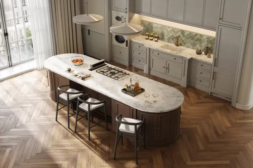 В трендах — плавные линии! Резкая геометрия уступает место скульптурным формам, которые придают пространству ощущение элегантности, выразительности, лёгкости. Если шкаф, то закруглённый везде, где можно, если остров — то овальный, в виде таблетки или полукруга.