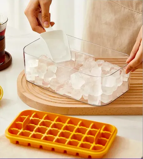 Если льда нужно много (возможно, вы задумали провести коктейльную новогоднюю вечеринку), то можно купить большую форму с поддоном. Когда лед замерзнет, нажимаете на кнопку, и всё кубики сразу высыпаются в поддон (их получится 32). Сама форма с крышкой, что тоже удобно: не будет посторонних запахов.