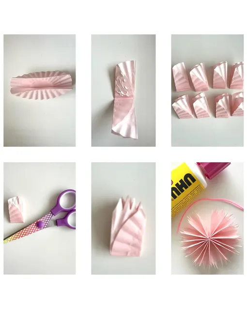 Необходимо сделать шаблон и по нему вырезать сложенные страницы. Когда заготовка будет готова, каждую страницу нужно склеить в нескольких местах, чтобы форма держалась. В итоге получится стильная объёмная игрушка.