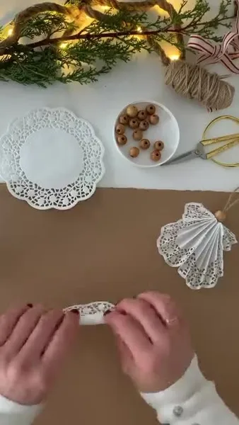 Для этого возьмите две салфетки, каждую сверните «гармошкой» и сложите пополам — так у вас получится платье и крылышки. Затем склейте салфетки между собой, пропустив посередине шнур с бусиной (это будет голова). Когда ангелочек готов, его можно повесить на ёлку или использовать в праздничном декоре.