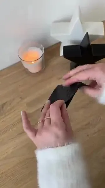 Это самый простой вариант новогоднего украшения. Вам понадобится прямоугольный лист бумаги. Сложите его гармошкой, затем согните пополам, перевяжите лентой и склейте концы. Получившаяся бумажная звезда отлично подойдёт для украшения ёлки или окна.