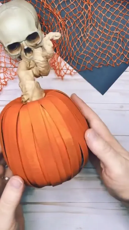 Носок плотно набиваем синтепоном или ватой, лишнюю ткань обрезаем и перевязываем бечёвкой. Затем этой же бечёвкой обматываем заготовку крест-накрест, формируя дольки. Кончик ткани закручиваем и фиксируем как хвостик — и готово. Такой простой декор своими руками отлично подойдёт для осеннего декора на Хэллоуин.