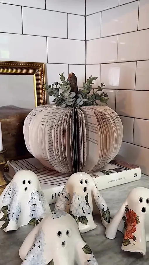Сделайте шаблон половинки тыквы и по нему канцелярским ножом вырежьте страницы, оставив корешок нетронутым. Затем раскройте книгу веером и склейте первую и последнюю страницы, чтобы зафиксировать объём. Сверху приклейте веточку-стебелёк и листья — и оригинальное осеннее украшение готово. Подобный декор своими руками — отличная альтернатива традиционным поделкам из тыкв.