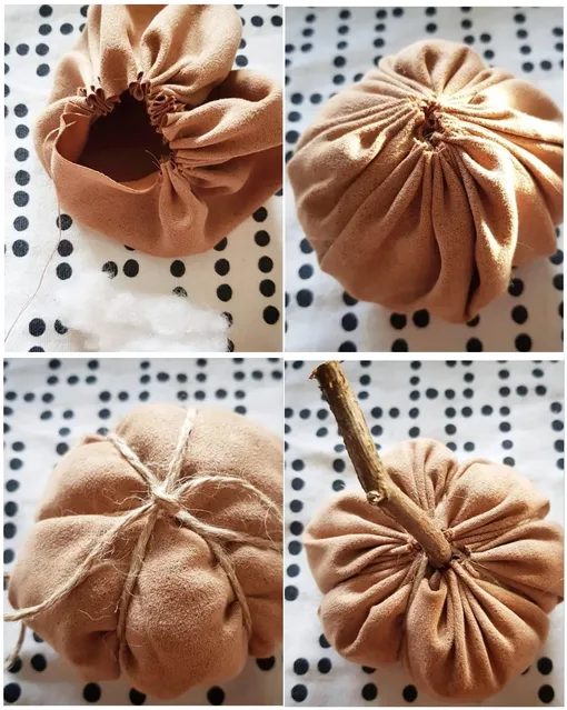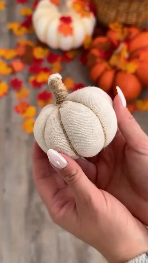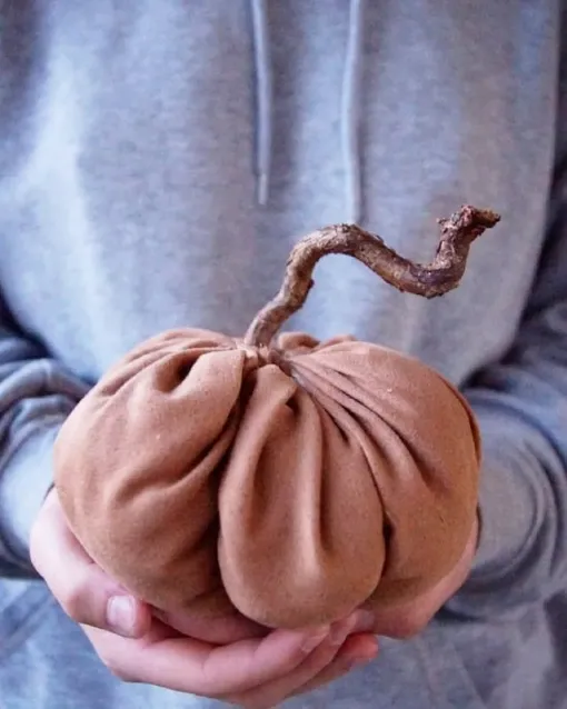 Несложно сделать тыкву из куска ткани. Простой мастер-класс на своей странице выложила блогер detgulahuset. Вырежьте из ткани небольшой круг, прошейте длинными стежками по краю и наполните ватой. Стяните, обвяжите заготовку шпагатом крест-накрест, чтобы сформировать характерные тыквенные дольки. Вставьте в отверстие палочку — и готово, получилась очаровательная текстильная тыковка.