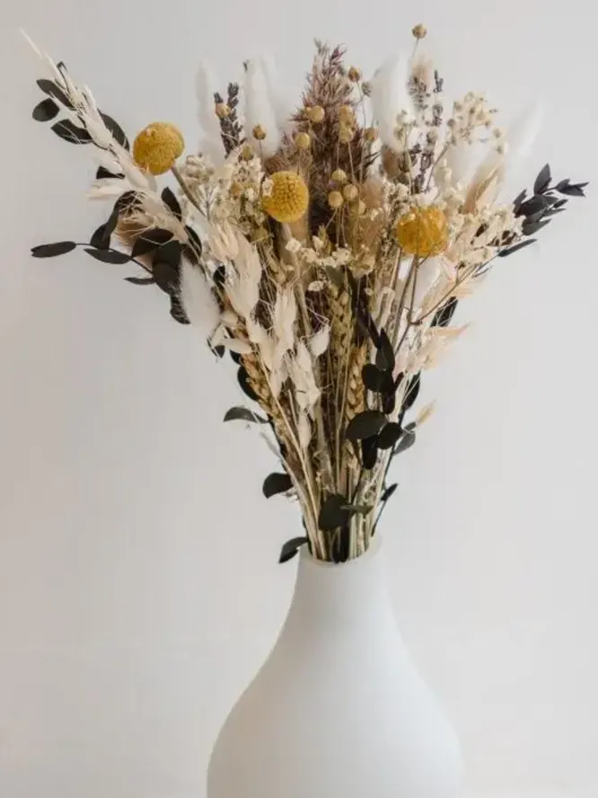 Соберите листья, ветки и сухоцветы в осенний букет для кухонного стола или полок. Такой декор прослужит весь сезон, а правильно стабилизированные растения могут храниться до пяти лет. Дополнить композицию можно мини-тыквами и маленькими сосновыми шишками, поиграв с объемами, высотой и асимметрией элементов декора.