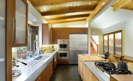 Потолок кухни играет ключевую роль в создании ощущения воздушности простраства. Чтобы компенсировать низкие потолки надо впускать в пространство больше естественного света и делать акцент на пол. Если же повесить на кухне объемную люстру или заставить ее гарнитурой на всю стену, тогда визуально потолок будет самым привлекающим элементом. Это создаст ощущение тесноты.