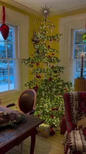 Для декора он советует использовать «гирлянду-росу». Дизайнер обвивает каждую ветку тонкой медной проволочной гирляндой:«Вы как будто мумифицируете ёлку», — объясняет он. Процесс занимает почти день, а иногда и полтора — только на гирлянды. Но, это, по его словам, того стоит.