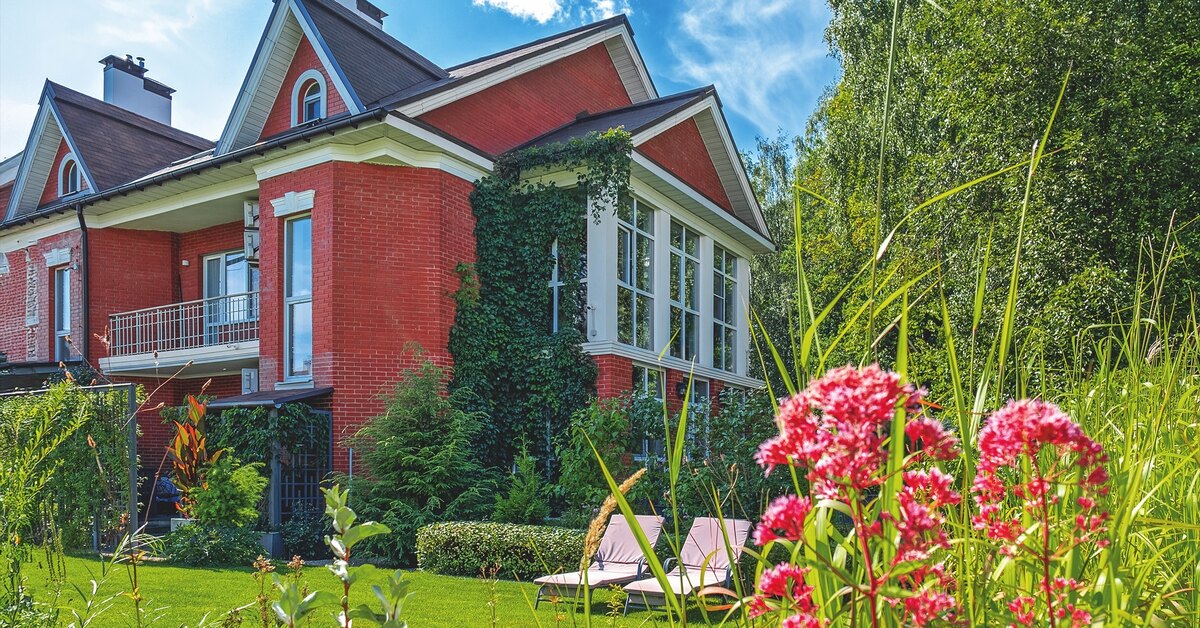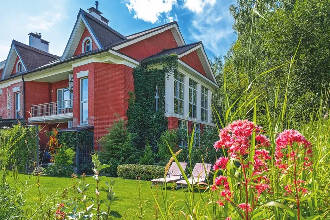 Дом из красного кирпича в английском стиле определил колористику растений: в саду преобладают белоцветущие кустарники, которые на протяжении лета не теряют декоративности.
