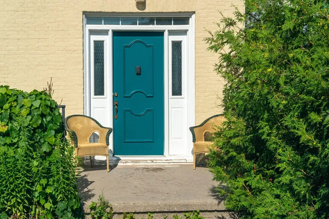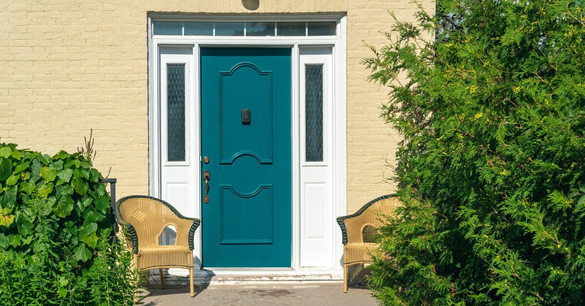 - Можно покрасить в смелый цвет входную дверь в квартиру со стороны подъезда — это сразу создаст нужное настроение у вас и гостей.