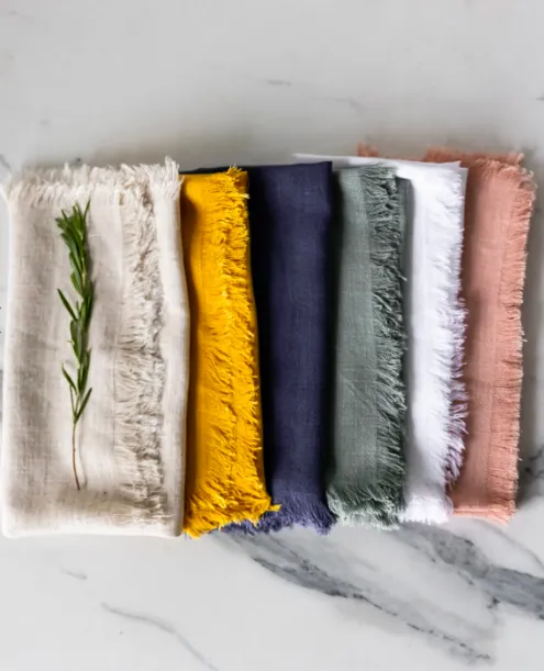 Эти салфетки идеальны по своей фактуре, приятны на ощупь и хорошо драпируются. Можно выбрать подходящий цвет из 6 возможных; белоснежный белый, желтая куркума, бежевый, королевский синий, пудрово-розовый и оливковый зеленый.