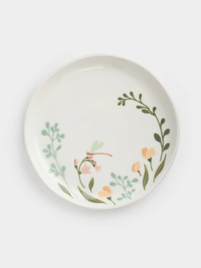 Закусочная тарелка с очень нежным узором из доломитовой керамики. Мыть вручную такую красоту — одно удовольствие.