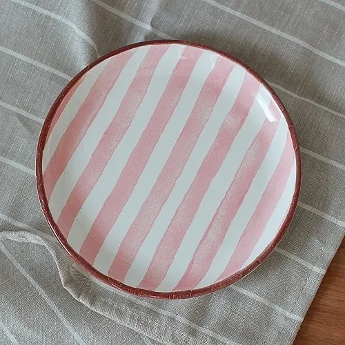 Керамическая тарелка в полоску теплого бежево-розового цвета для десертов и небольших закусок.