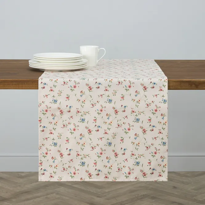 Текстильная дорожка с мелким цветочным узором — простой способ оживить сервировку и добавить уюта. Смотрится ненавязчиво, но очень стильно, особенно в сочетании с однотонной посудой.