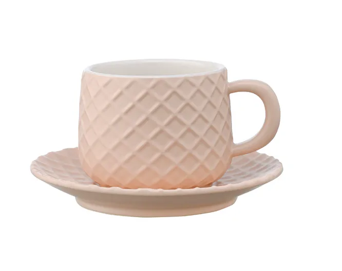 Чашка и блюдце из каменной керамики с глазурованным покрытием. Узор напоминает соты или вафельный пломбир, а необычная утолщенная ручка придает особый шарм этой паре.