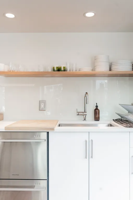 Если вы действительно ненавидите свои шкафы и не хотите спасать ни одну их часть, вы можете удалить их полностью. Но стоимость их замены на новые может быть довольно высокой. Поэтому более доступная альтернатива — заменить их открытыми стеллажами. Так ваша кухня сразу же станет выглядеть более современной и свежей. Только убедитесь, что стеллажи правильного размера и достаточно прочные для тяжёлых предметов, таких как блюда и тарелки. Имейте в виду, что вы, вероятно, захотите сделать это только с верхними шкафами, а нижние оставить закрытыми для хранения менее эстетичных предметов, таких как кастрюли, сковородки и мелкая бытовая техника.