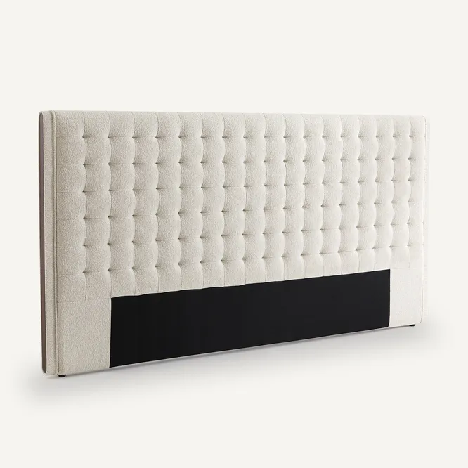 Что отличает обычную кровать от кровати из дорогого отеля? Конечно, изголовье. Массивное, из качественных материалов, современного дизайна. Например, с каретной обивкой. Даже самая простенькая кровать станет королевской в таком обрамлении. Ткань у этого изголовья — букле. В 2025 году этот плюшевый материал стал фаворитом мебельных трендов.