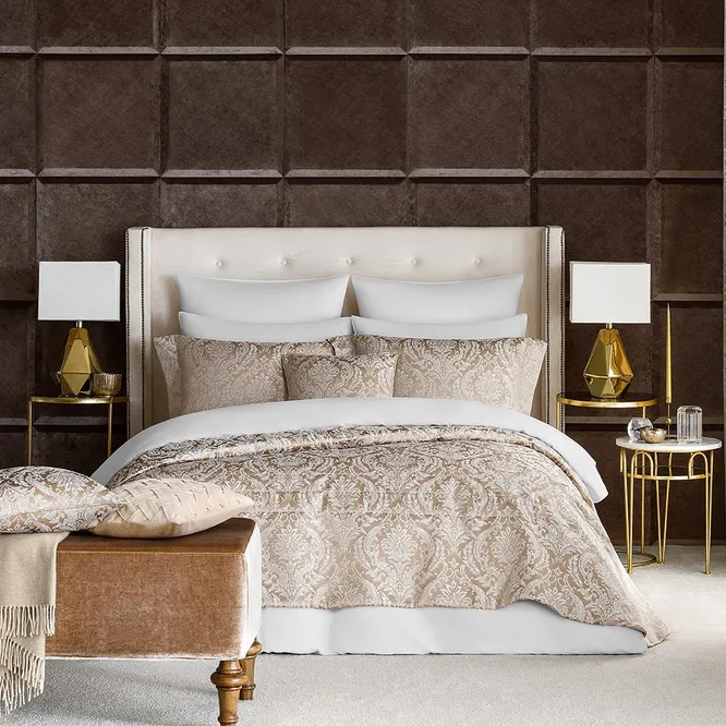 Придать кровать роскошный вид также поможет покрывало в тон подушкам. Стелите его с отступом и не экономьте на размере — текстиль должен спускаться по краям кровати до самого пола и выглядеть массивно и дорого.