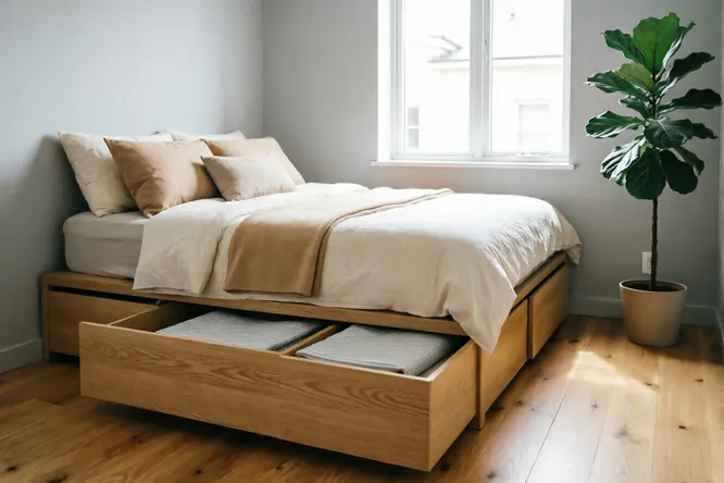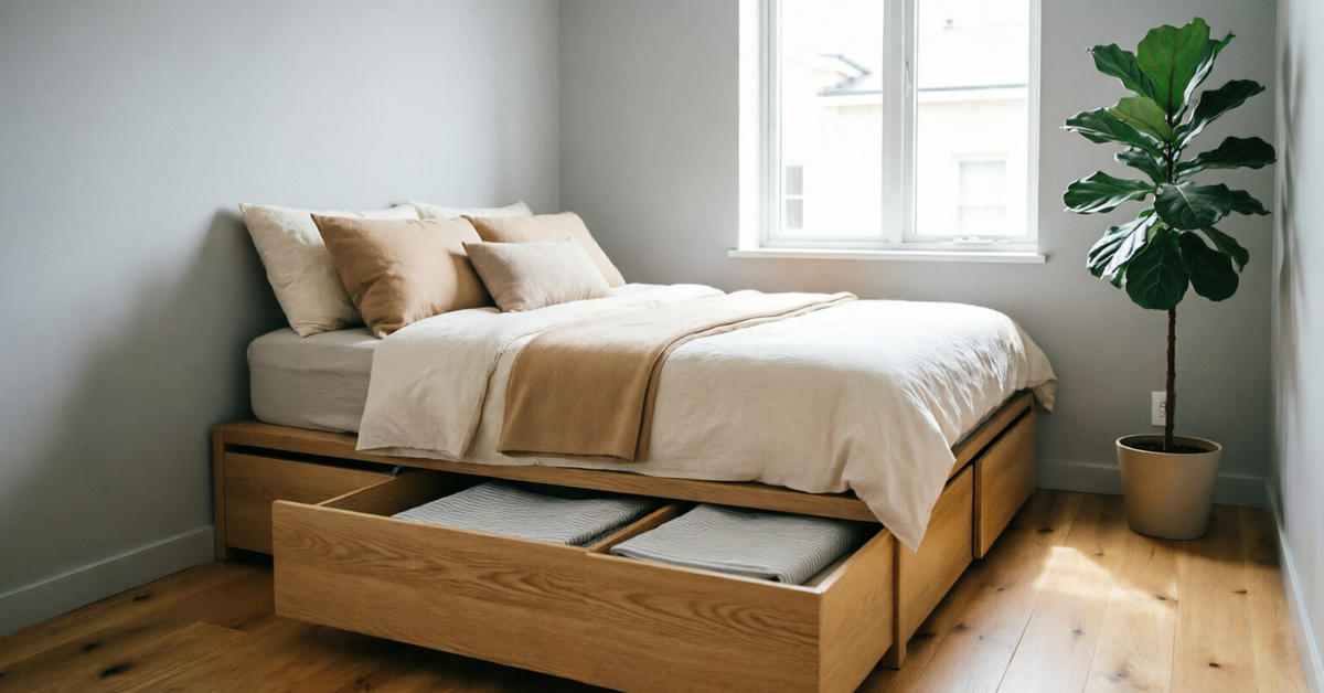Ящики под кроватью или диваном — один из самых эффективных способов скрытого хранения. Кровать с подъемным механизмом (газлифт) вмещает в себя едва ли не половину гардероба, а также зимние одеяла или летние легкие покрывала.