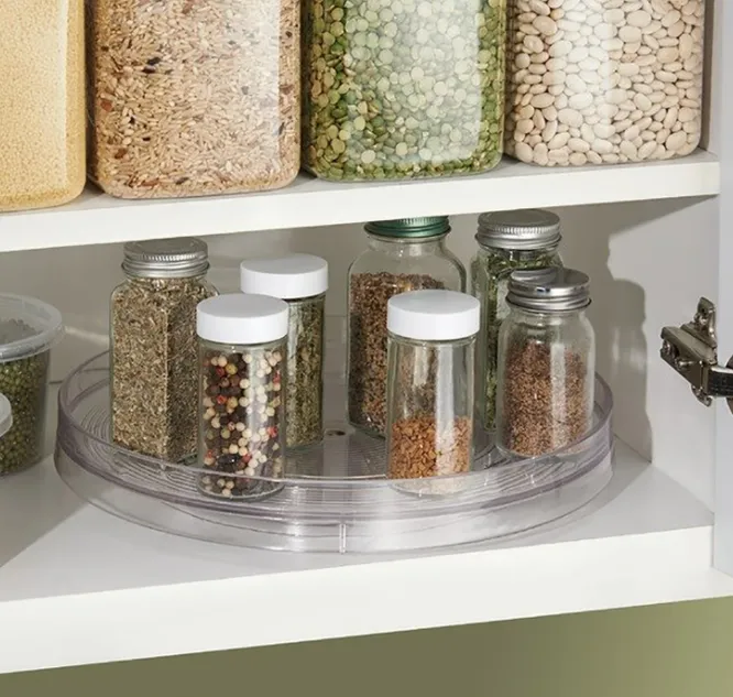 Этот вращающийся двухъярусный стеллаж определённо поместится в настенные шкафчики вашего кухонного гарнитура. Вы можете расставить банки в алфавитном порядке, по частоте использования или назначению (например, для выпечки или приготовления мяса).