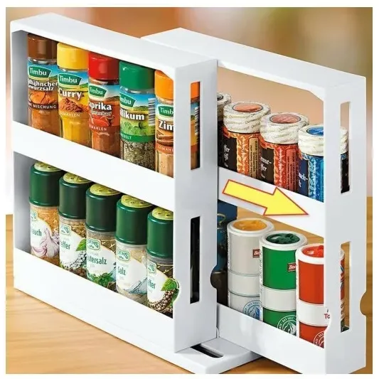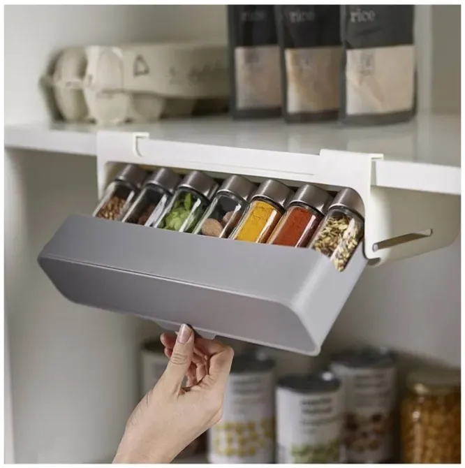 Этот подвесной органайзер с выдвижным отделением занимает совсем мало места, но вмещает до шести стандартных банок для специй, которые уже входят в комплект. Все ёмкости изготовлены из стекла и пищевой нержавеющей стали, не впитывают запахи и позволяют специям и пряностям дольше сохранять свои свойства. У крышек банок есть три вида дозировки: для мелких, средних и крупных специй. Органайзер можно повесить на внутреннюю полку шкафа или снаружи на донную полку. Приклеивается он на прочный двусторонний скотч.