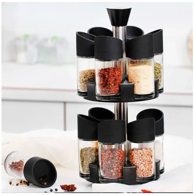 Изучите свою коллекцию приправ и выберите 12 наиболее используемых трав и специй. Затем высыпьте их в герметичные пластиковые баночки, которые входят в набор, чтобы вы могли выставить их на вращающейся подставке. У всех 12 контейнеров есть разные отверстия для крупных и мелких специй.