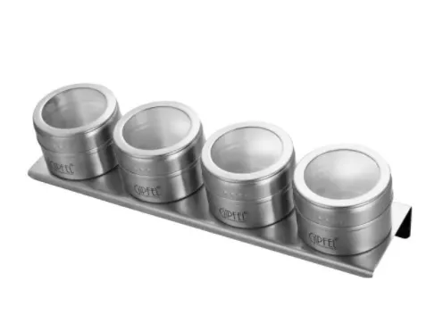 Сильные магниты хорошо фиксируются на подставке и не дают баночкам соскользнуть с места. Так как крышки у них стеклянные, вы сможете сразу разглядеть, какие специи находятся в той или иной ёмкости.