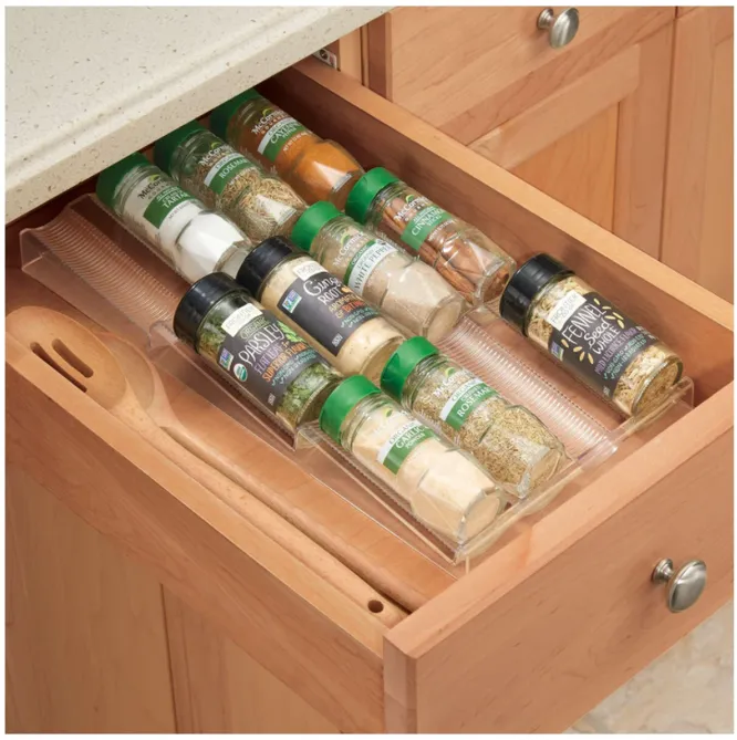 Если в вашем кухонном ящике со специями уже давно царит хаос, попробуйте такой удобный вариант органайзера. У пластиковой подставки есть три уровня, расположенных под углом, что облегчает поиск нужной приправы. Специальные выемки округлой формы идеально подходят для стандартных банок со специями.