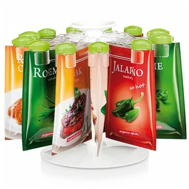 Вот ещё один оригинальный и очень компактный вариант хранения приправ. В набор входят 12 сменных насадок для специй разного помола и 12 пластиковых зажимов для открытых пакетиков.