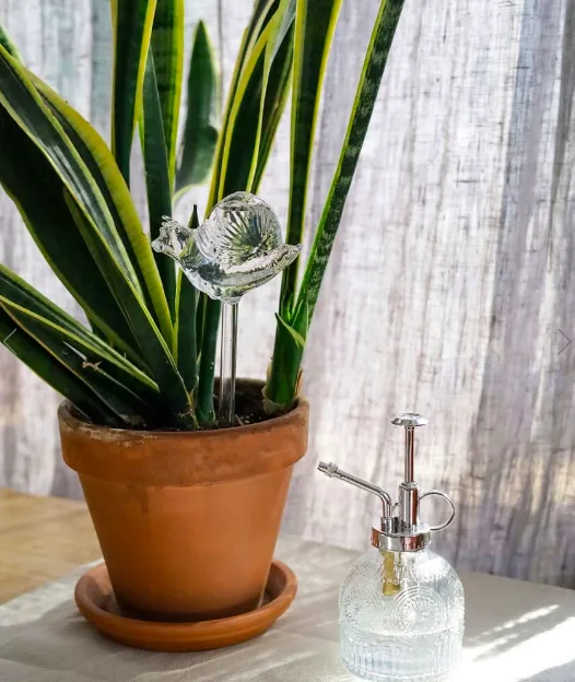 Стеклянные колбы для автополива созданы для тех, кто забывает поливать цветы или часто уезжает из дома. Суть проста: нужно наполнить колбу водой, вставить под углом, и растения будут пить столько воды, сколько нужно. Важно, чтобы ножка колбы не забилась грунтом, поэтому нужно сделать заранее отверстие в грунте.
