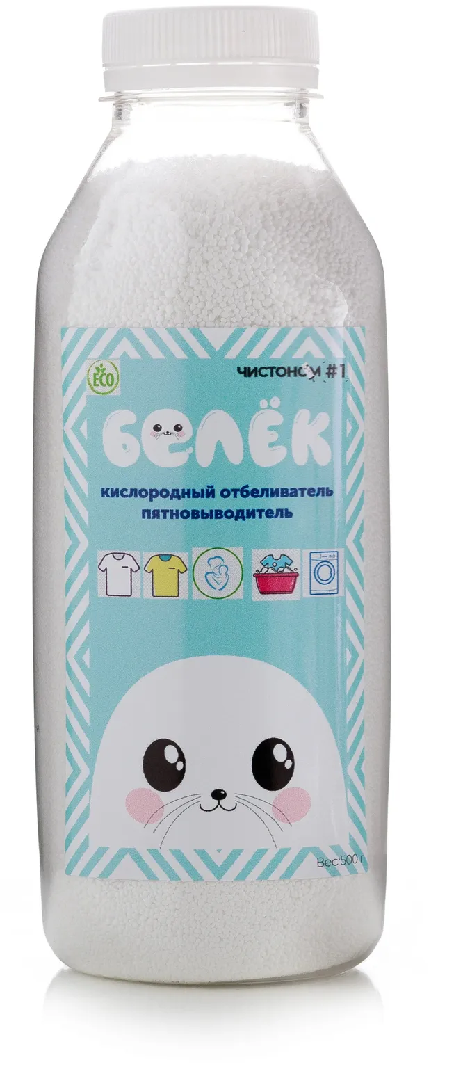 Белёк на 100% состоит из перкарбоната натрия с самым высоким содержанием активного кислорода. Подходит для цветных вещей и эффективно отбеливает белые, не нарушая структуру ткани. Безопасен и экологичен, подходит для стирки детских вещей. Справляется не только с грязью, но и с чаем, кофе, соками, соусами и травой. Также эффективно нейтрализует неприятные запахи.