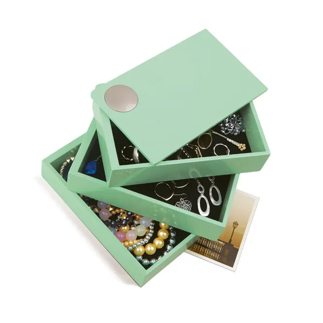 В этой шкатулке можно хранить не только украшения, но и фотографии размером 10*15 см, открытки или письма. Отделения открываются, сдвигаясь в одну сторону, а чтобы украшения не царапались, дно каждого отделения покрыто черным велюром.