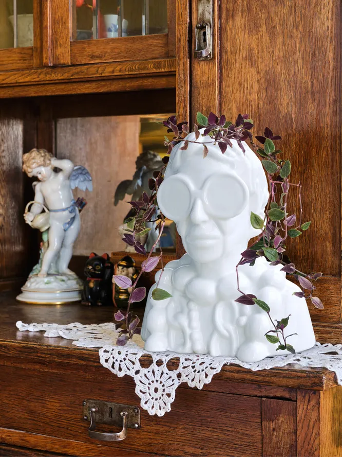 Ваза, стилизованная под бюст самого старого в мире тинэйджера и фэшн-философа современности, Айрис Апфель, обязательно понравится любителям причудливых, необычных предметов. Один из базовых принципов: – интерьер должен вызывать эмоции. Невозможно найти собственный стиль, следуя чужим заповедям, так что можно наплевать на всех и создавать свой собственный мир среди моря штампованных интерьеров.