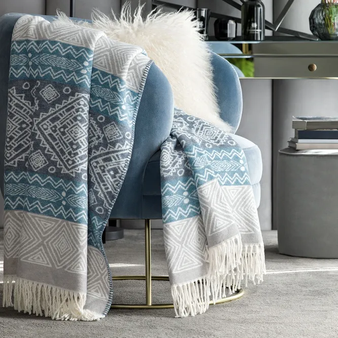 Мягкий и нежный плед из натуральных волокон хорошо попускает воздух. Под ним не жарко, зато очень уютно и тепло. У пледа велюровая приятная на ощупь текстура, необычный этнический орнамент и белоснежная бахрома, а края с двух сторон обшиты вручную контрастными нитями.