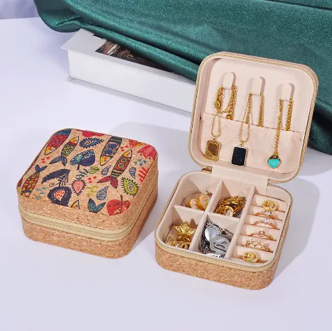 Ещё один вариант – побольше. Дорожная шкатулка из пробкового дерева. Внутри: секции для колец, крючки для цепочек и браслетов, отсек с перегородкой для крупных предметов.