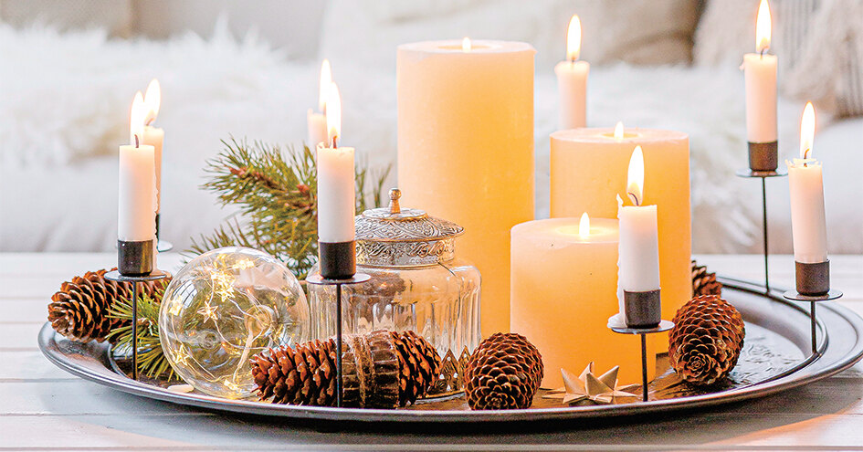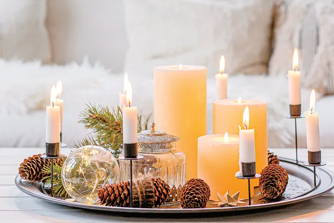 Соберите настольную композицию в вазе из искусственных и свежих веток, выберите из своей коллекции ёлочные игрушки в одной гамме и разложите на подносе, добавьте шишки и свечи в стаканчиках. Если вы принесли ветки из леса — «искупайте» их в воде, встряхните, обновите срезы секатором и слегка раздробите концы молотком — так они лучше будут впитывать воду и простоят дольше.