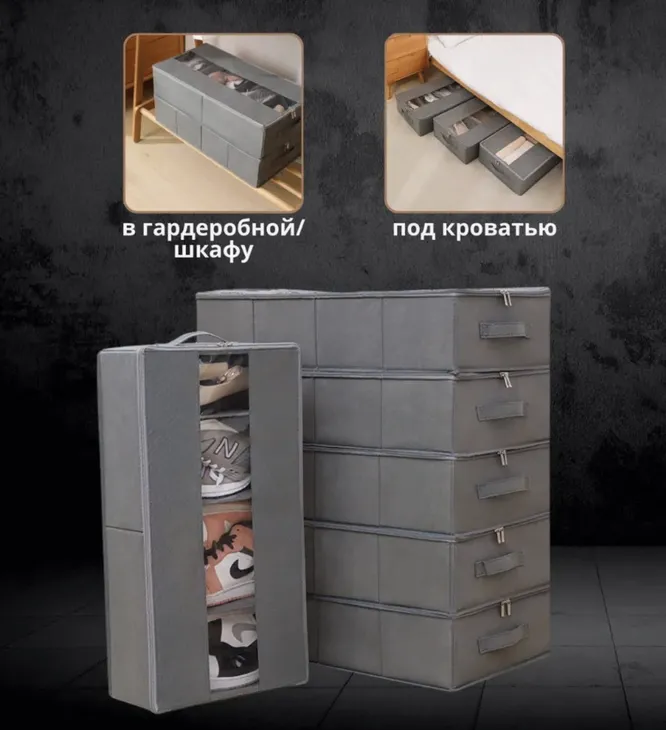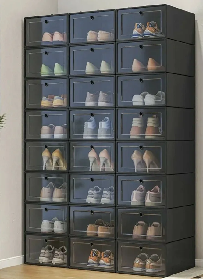 Прозрачные пластиковые коробки — решение для тех, кто хочет, чтобы каждая пара обуви хранилась отдельно. Надёжно защищают обувь от пыли, влаги и деформации, а благодаря прозрачной вставке, вы сразу видите, что внутри, — удобно и экономит время на поиск нужной пары.