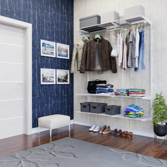 Гардеробные системы – это довольно бюджетное и удобное решение для установки. Конструкция универсальная, подходит для любого помещения, а количество и высоту полок можно подстраивать под свои нужды. Среди плюсов – полный обзор всей одежды и быстрый доступ.