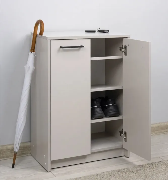 Если вы предпочитаете закрытое хранение, обратите внимание на обувные шкафчики с дверцами — они помогут визуально устранить беспорядок и защитят обувь от пыли. Важно выбирать модели с регулируемыми по высоте полками: это даёт больше гибкости и позволяет адаптировать пространство под разную обувь. В этой модели полки установлены под углом, что удобно для размещения обувных пар большого размера.