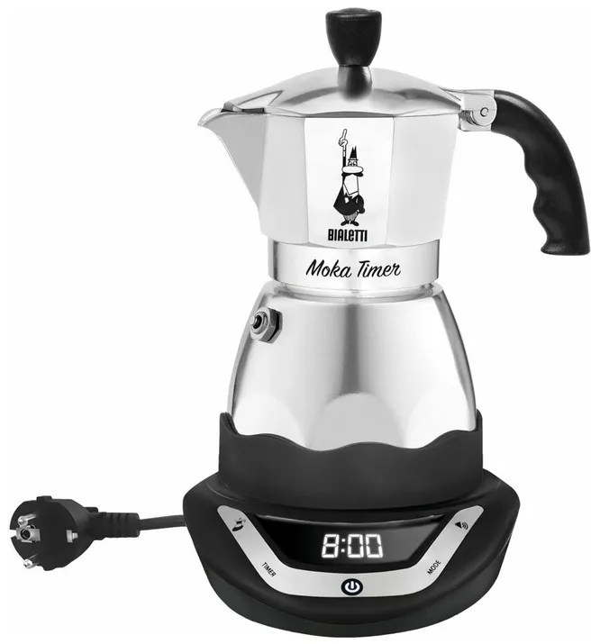 Электрическая гейзерная кофеварка со встроенным таймером имеет 2 режима работы: ручной и автоматический. Последний позволяет запрограммировать приготовление кофе на нужное время и не требует контроля, так как после заваривания она автоматически отключается. Процесс приготовления кофе занимает около 5-7 минут. Кофеварка изготовлена из алюминия и может поддерживать температуру в течение 30 минут. Объём: 240 мл (6 чашек для эспрессо по 40 мл).