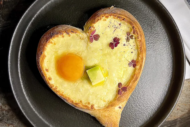 6. Раскатать тесто в виде круглой лепешки диаметром 10-15 см, сверху распределить 75 гр сырной начинки, заворачивать сыр от краев к центру, защипать края, сформировать Хачапури в форме сердца.